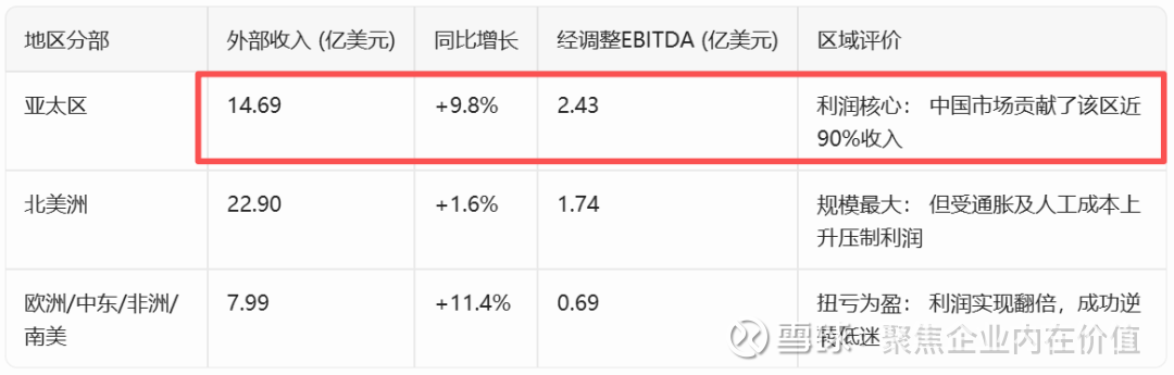 亚太区(强劲驱动):收入达 14.69亿美元,同比增长约 9.8%,且其经调整EBITDA(2.43亿美元)在所有分部中最高,是集团利润的核心贡献者 。