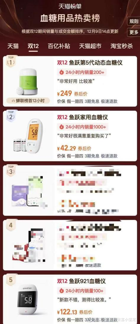 根据天猫的最新榜单显示,鱼跃第五代CGM排名天猫“双12”血糖用品热卖榜第一。鱼跃第五代CGM可连续测糖16天,MARD值低至8.58%,每三分钟测量一次血糖值,提供多维度血糖报告,控糖分析量身定制,助力居民持续准确测糖,科学控糖减重。得益于销售规模的扩张和生产良率的提升,公司CGM生产成本不断降低,这给降低消费者使用成本创造了条件。目前鱼跃第五代CGM年卡费用降低至4305.6元/年,即153.8元/盒,约12元/天。使用成本降低有利于进一步扩大销售规模,从而进一步降低使用成本,形成良性正循环,未来CGM领域能活得好的品牌可能也就五家,鱼跃必然是其中之一。值得注意的是,鱼跃另两款BGM血糖仪590和血糖仪921也进入了前五名。血糖用品天猫热卖榜前五名鱼跃产品占据3席,彰显了鱼跃医疗在血糖管理领域强大的综合竞争能力。