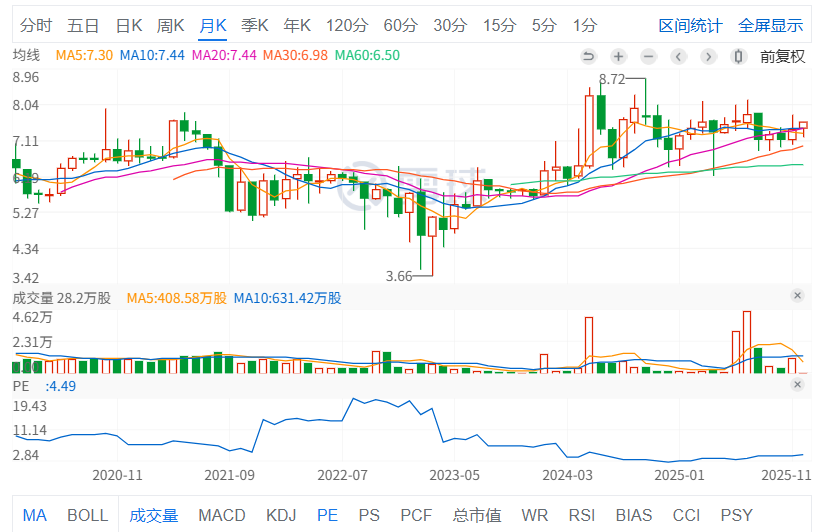 公司的股价比较平稳,五年内基本在5-7元徘徊。
