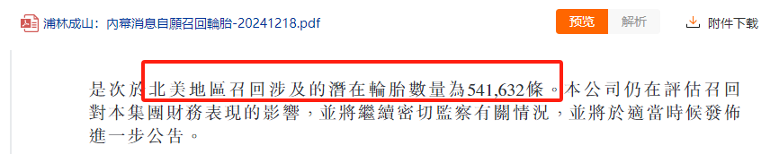 公司在2024年12月公告召回54万条北美地区轮胎,此举会影响部分公司利润。