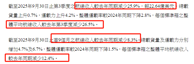 海丰国际在2025年前三季度收入24.6亿美元,2024年前三季度21亿美元。