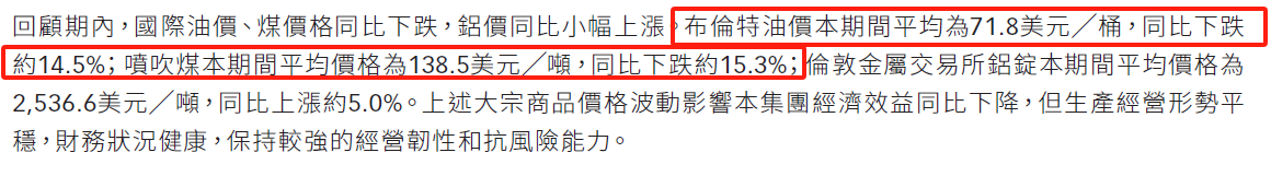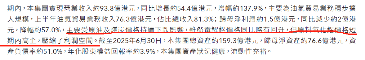 25年上半年总营收93.8亿元,油气贸易76.3亿元、油气业务5.7亿元、电解铝8.9亿元、煤3亿元;