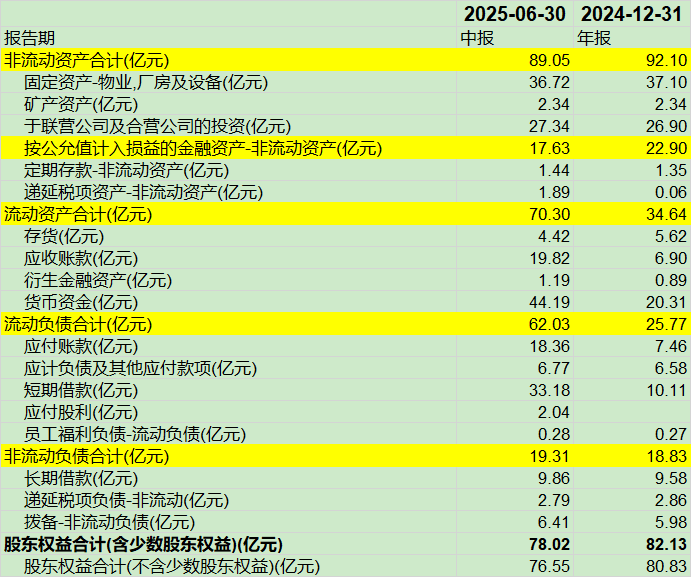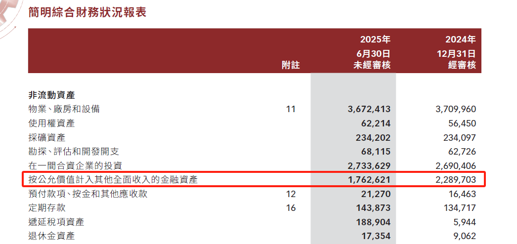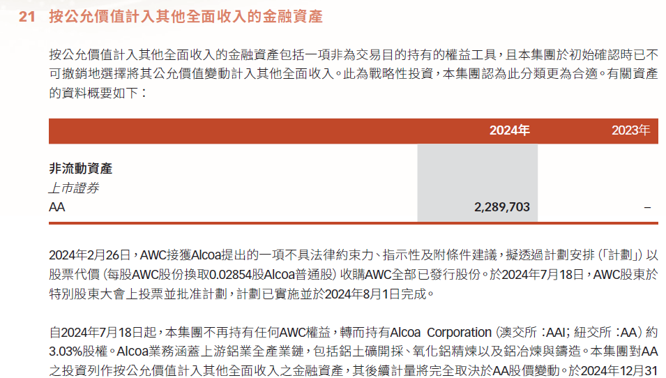 公司资产中按公允价值的金融资产25年中期为17.6亿元,24年底为22.8亿元,主要为AA的 3.03%的股权。