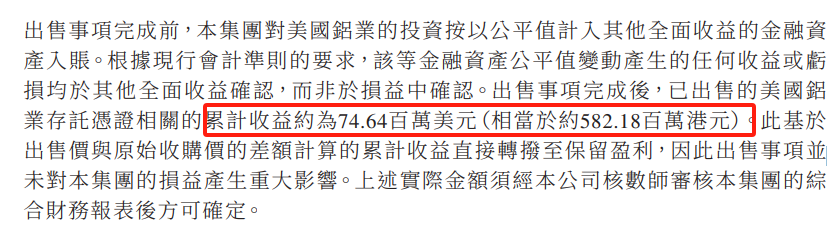 已经出售的部分盈利5.8亿元。