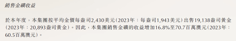 2025年上半年销售1万盎司,均价3123美元,销售成本2066澳元/盎司(1380美元/盎司)。差价1743美元/盎司,利润0.65亿港币。