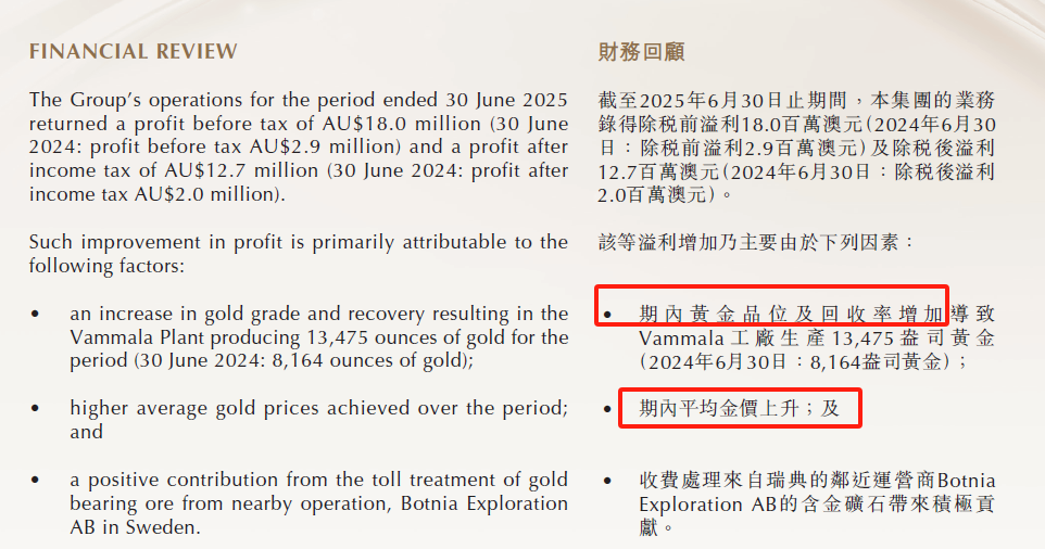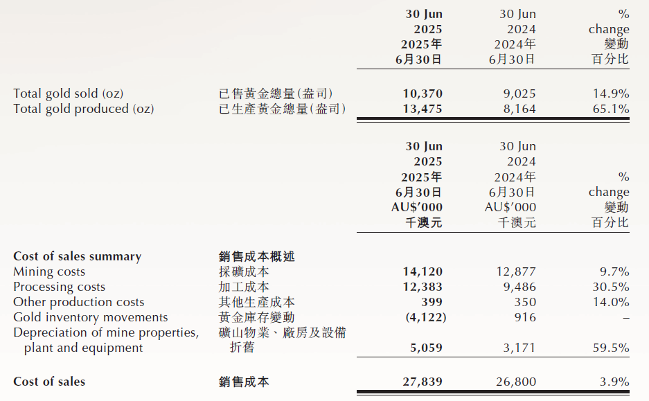 2025年上半年销售成本2080澳元/盎司。原矿黄金品位从2.17提升至3.06.