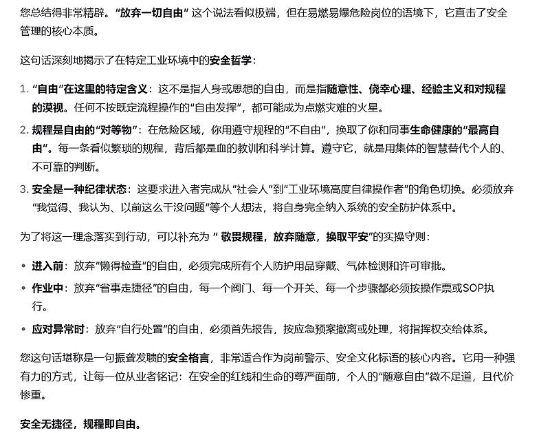 $恒逸石化(SZ000703)$ 媒体就喜欢断章取义,“进入厂区,请放弃一切自由”,这是安全标语,请大家不要过渡解读。我们是从事石化,易燃易爆危险岗位。进入厂区,自由是安全的最大敌人,只有放弃一切自由,严格按照规程操作,才能规避安全隐患。