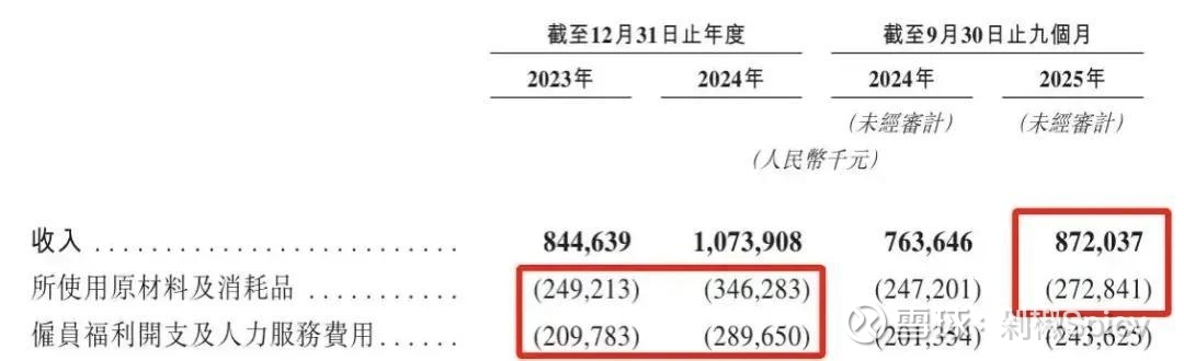 其原材料及消耗品支出从2023年的2.49亿元增至2024年的3.46亿元,涨近39%,这一数值在2025年前三季度同比增长10.53%至2.73亿元。