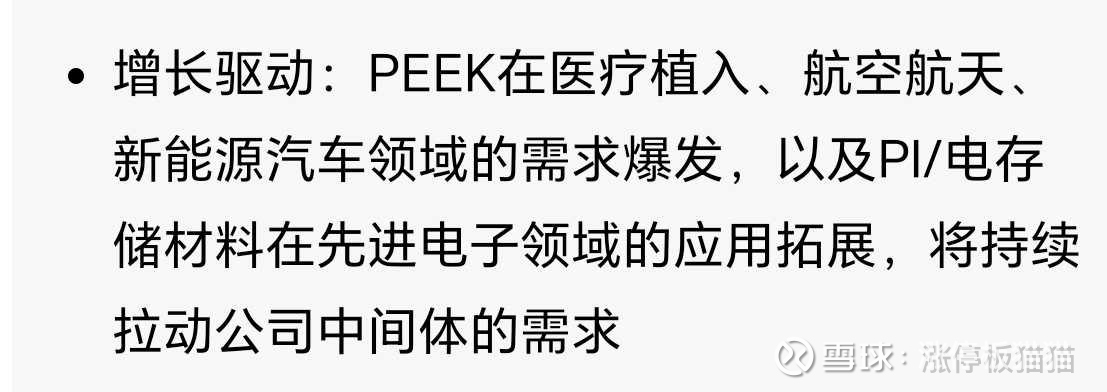 PEEK在医疗植入、航空航天、新能源汽车领域的需求爆发,以及PI/电存储材料在先进电子领域的应用拓展,将持续拉动公司中间体的需求
