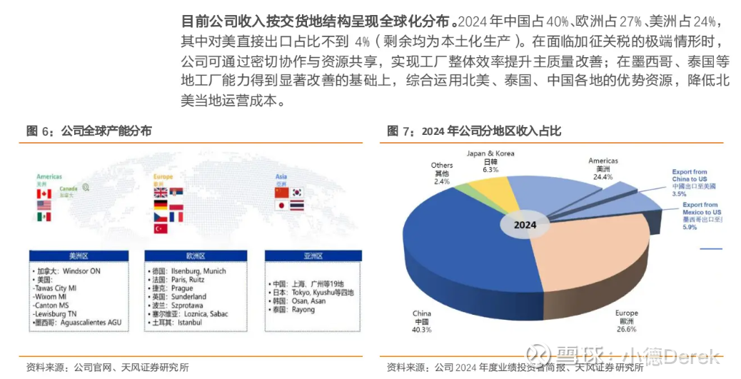 第一,海外直接交付能力。敏实工厂分布全球各地,美国、加南大、墨西哥、欧洲、东南亚等国家均有现代化工厂。按交付地,24年美洲(主要是美国)交付占比24.4%,其中从中国出口至美国的交付仅占24.4%其中的14%(并仍在持续下降),其余为美国工厂本地化交付及墨西哥等海外工厂交付,中美关税战对敏实影响远小于以国内产能为主的汽车零部件厂商。可以说在产能出海方面,敏实和福耀玻璃是中国汽车零部件公司中做的最早也最好的两家公司。在未来的多极化世界中,本地交付能力是重要竞争力。