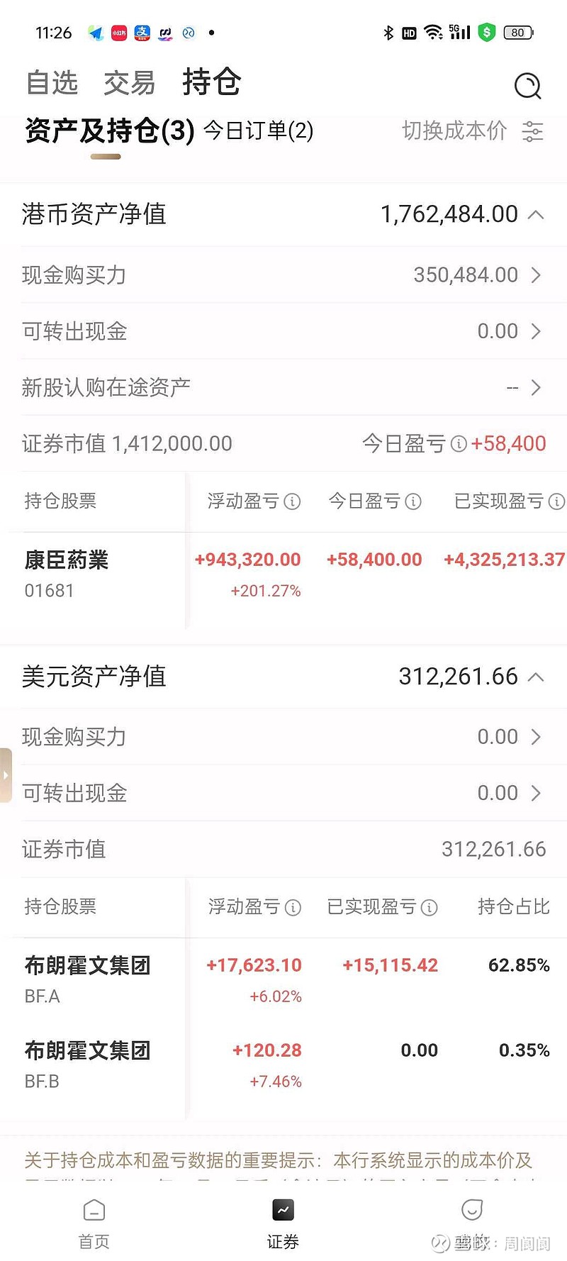 $康臣药业(01681)$ 这是我人生中从2015年开始,省吃俭用省下的80万人民币用于投资康臣药业(其实收益远高于500万港币,期间分红再买入系统未显示出来),目前获得账面浮盈记录一下,把这份经验要传给子孙后代(在雪球记录不是来炫富的,富裕的人比我多了去,我只是把雪球当笔记本,若干年等我暮年的时候可以回看我的笔记,我更不是来推销自己招揽粉丝的)。承认自己平庸之辈,那么就把钱投资到你认为优秀人经营的上市公司里边。康臣药业我没有清仓,等待更好的减持价格。目前减持的原因是因为有更好的投资机会.