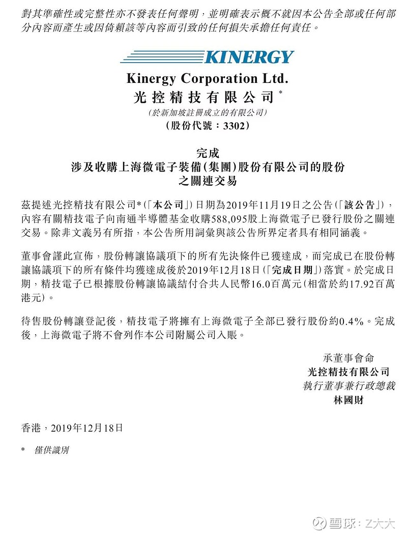 4、 投资SMEE:2019年从二股东光大控股下的南通半导体基金收购了SMEE0.4%股份,以便后续更好的与SMEE合作。按照SMEE上市后3000-6000亿的市值,单这一部分股权就是好多倍公司市值。