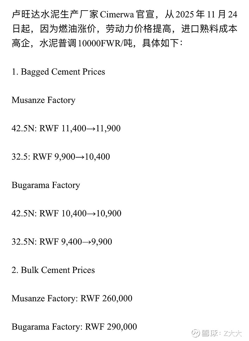 西泥在卢旺达一年有50万吨左右的量,近期卢旺达水泥价格全面上调,425涨到1160元,325涨到1015元。后续就看埃塞什么时候能实质性提价。
