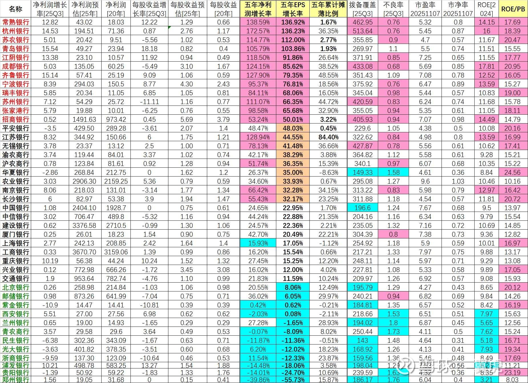 按照以上思路,根据2025年三季度所有银行的数据,对银行25年的每股收益和净利润增速进行预估,同时把个别股票分红时送股、转股的情况进行折算,得到所有银行近五年的财务数据,经统计和排序,结果如下图所示: