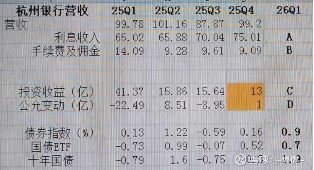 杭州银行2025年的每个季度的营收数据如上图所示,根据杭州银行的2025年业绩快报数据可以知道,25年四季度利息收入75.01亿,手续费及佣金9.09亿,扣除其他收入后,剩下的投资收益+公允价值变动约14亿元,按照债券市场的情况,分配为投资收益13亿+公允变动1亿。