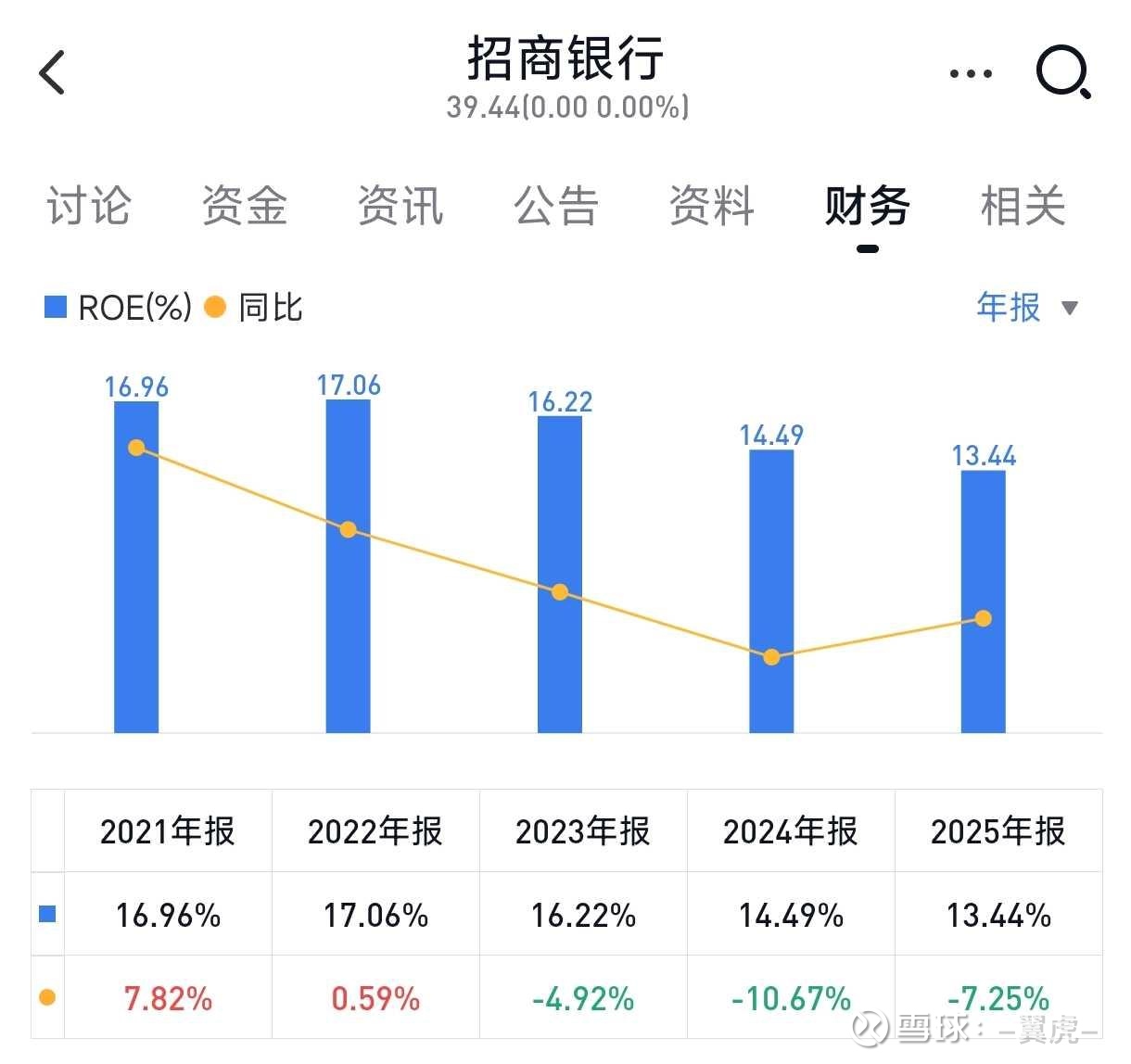 招商银行作为一个ROE逐步下降走下坡路的银行股,一大堆所谓的银行股大V站台。按照招商银行的2025年报,四季度信用卡新增不良一百多亿,超过前三季度总和,正常贷款迁徙率维持高位意味着新生不良依然会比较多,全年资产增速只有杭州成都宁波南京江苏等银行股的一半。银行股的季节性变化不会太大,按此趋势看,2026年招商银行的营收增速不会太高,大概也就5%左右,净利润增速也差不多在5%左右,由于净利润增速(5)+分红收益率(5)<ROE,所以2026年招商银行的ROE会继续下降。