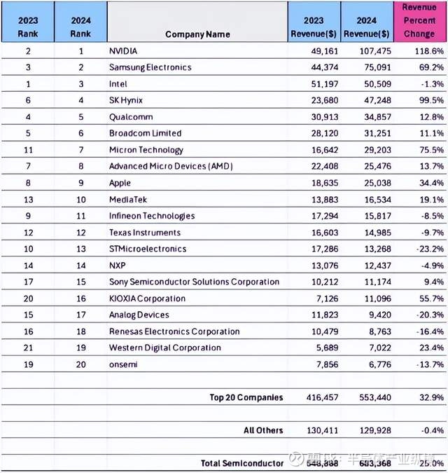 上图显示,AI和内存相关的公司在排名中普遍上升,三星、SK海力士和美光等内存芯片制造商在2024年均成功跻身全球芯片市场前七大公司之列。
