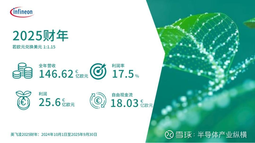 2025财年全年营收为146.62亿欧元,同比下降2%;利润为25.6亿欧元;利润率为17.5%;调整后每股收益为1.39欧元;由于收购Marvell公司汽车以太网业务,自由现金流为负10.51亿欧元;调整后的自由现金流为正18.03亿欧元。