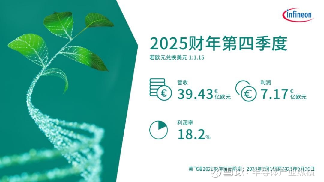 今日,英飞凌公布了2025财年第四季度及2025全年财报(数据均截至2025年9月30日)。2025财年第四季度:营收为39.43亿欧元,利润为7.17亿欧元,利润率 18.2%。