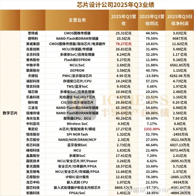 数字芯片设计公司中,豪威集团Q3营收规模居首,达78.27亿元。细分来看,本文统计中的数字芯片公司,主要分为AI/高性能计算、存储控制、MCU/SoC、通信基带、FPGA/安全芯片。整体来看,AI相关品类成为最大亮点,传统消费类芯片则呈现温和复苏态势。
