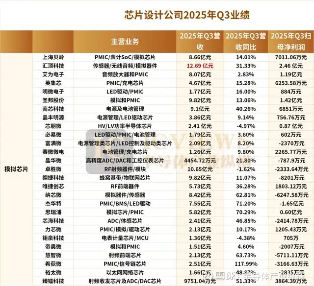 模拟芯片设计公司中,汇顶科技Q3营收规模居首,达12.69亿元。总的来说,模拟芯片市场仍然处于较为低迷的复苏周期中,未有数字芯片市场般超500%高位数增长的公司出现。