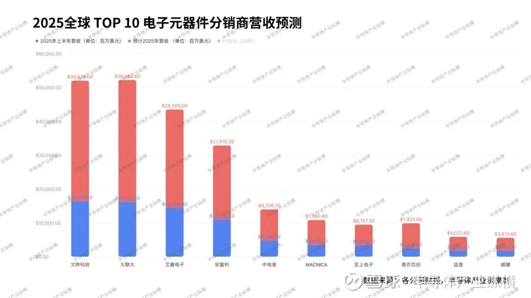 文晔科技依旧为全球最大的元器件分销商,但第二名有所变化。以2024年全年营收为参照,大联大在今年上半年以28.1%的增幅超过艾睿电子,晋升为全球元器件分销商第二位,与排名第一的文晔科技营收差距为2.4亿美元。中国台湾的分销商至上电子,在2025年上半年营收下滑18.8%跌出榜单前五,2024年营收排名第六的国内元器件分销公司中电港因此进入全球前五。
