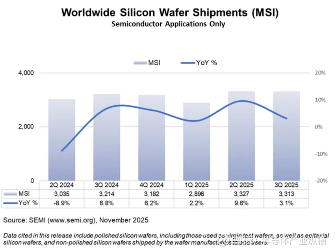 从SEMI最新数据来看,全球硅片市场正在经历缓慢但明确的复苏。2025年第三季度全球半导体硅片出货面积达到33.13亿平方英英寸,同比增长3.1%。虽然环比2025年第二季度微降0.4%,但同比增长的趋势表明市场正在从2024年的低谷中逐步恢复。