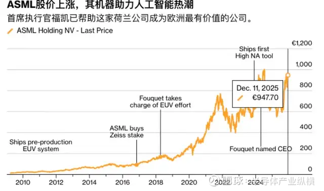 ASML今年的营收有望增长约15%,达到325亿欧元,利润增长27%,达到96亿欧元。其股价今年已上涨约40%,市值达到约4300亿美元,成为欧洲市值最高的公司。17年前,当福凯加入这家当时还“默默无闻”的公司时,其市值不足100亿美元。