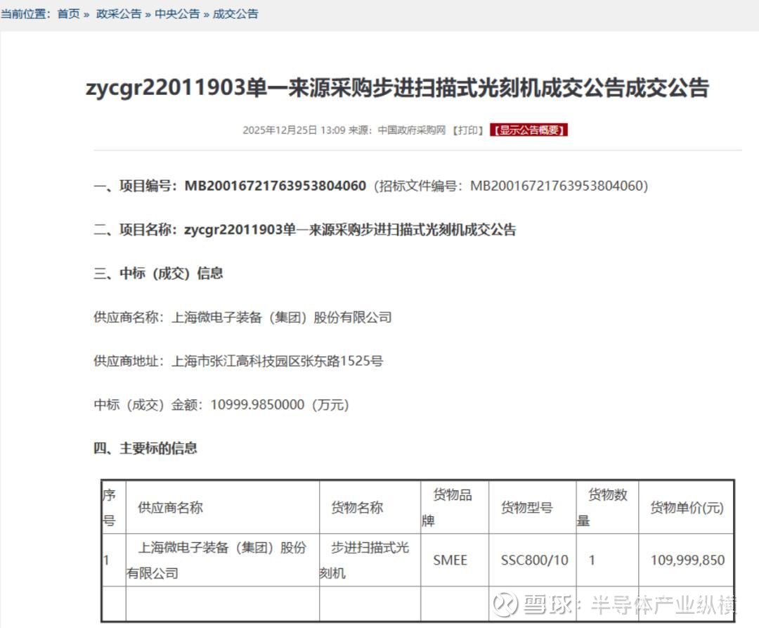 公告显示,中标供应商名称为上海微电子装备(集团)股份有限公司,供应商地址为上海市张江高科技园区张东路1525号。中标货物名称为步进扫描式光刻机,货物型号为SSC800/10。