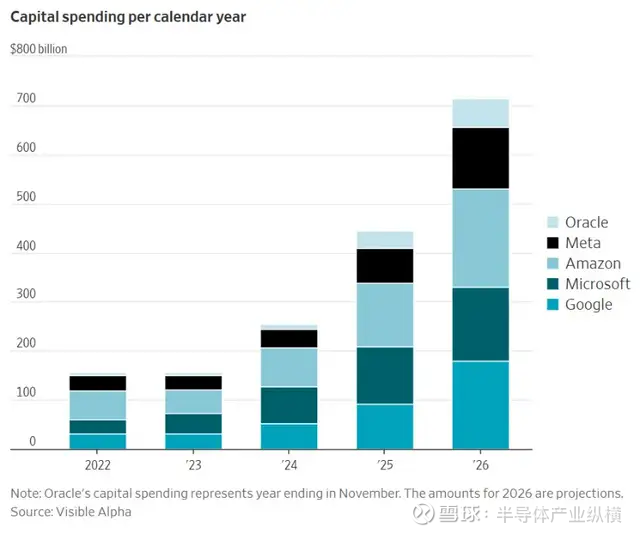投资者对AI的忧虑并没有迫使最大的科技公司缩减其在该技术上的押注。谷歌、Meta Platforms和亚马逊都在其最新的季度报告中预计今年的资本支出将大幅增加。华尔街还预计微软和甲骨文在此期间也会有显著增长。综合来看,这就五家公司预计今年总共将支出7150亿美元。这将比去年增加60%。