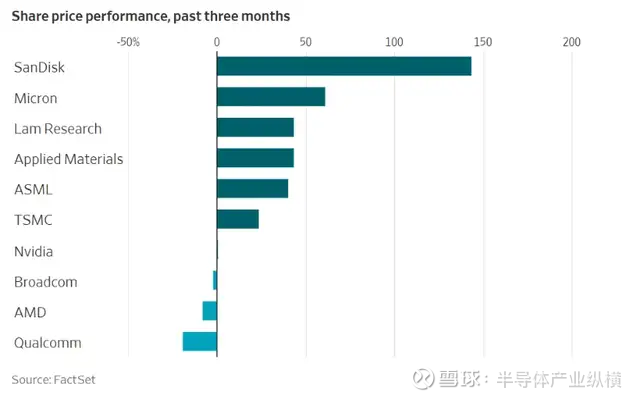 闪存制造商SanDisk在过去三个月中市值翻了一番多,而美光飙升了60%以上。泛林集团(Lam Research)是一家在存储领域拥有大量敞口的芯片制造工具制造商,其股价上涨了40%以上。