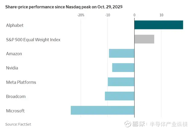 虽然该公司迅速否认了对其言论的这种解读,但这仍被视为AI领域顶层不稳定的又一迹象。那周许多主要科技股大幅下跌,拖累了前一周刚刚创下历史新高的纳斯达克指数。而且大多数股票尚未恢复元气。谷歌母公司Alphabet是自纳斯达克见顶以来唯一上涨的AI相关科技巨头股票。