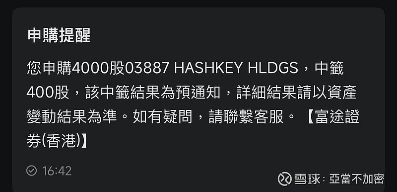 $HASHKEY HLDGS(03887)$ 中签10%,希望有肉吃,毕竟行业在港股的第一只标的。话说最近港股打新年末增加很多$轻松健康(02661)$$翰思艾泰-B(03378)$ 诺比侃或多或少都可以关注下,打新赌的成份大很多,也要看承销给不给力。#新股申购# #新股研究# #港股黄金股走强,紫金黄金国际大涨#