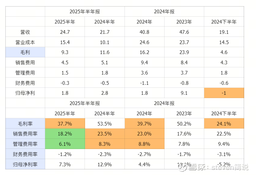 2025年上半年,营收增加,三费率控制,但毛利率大幅减少,最终净利率降低,净利减少。