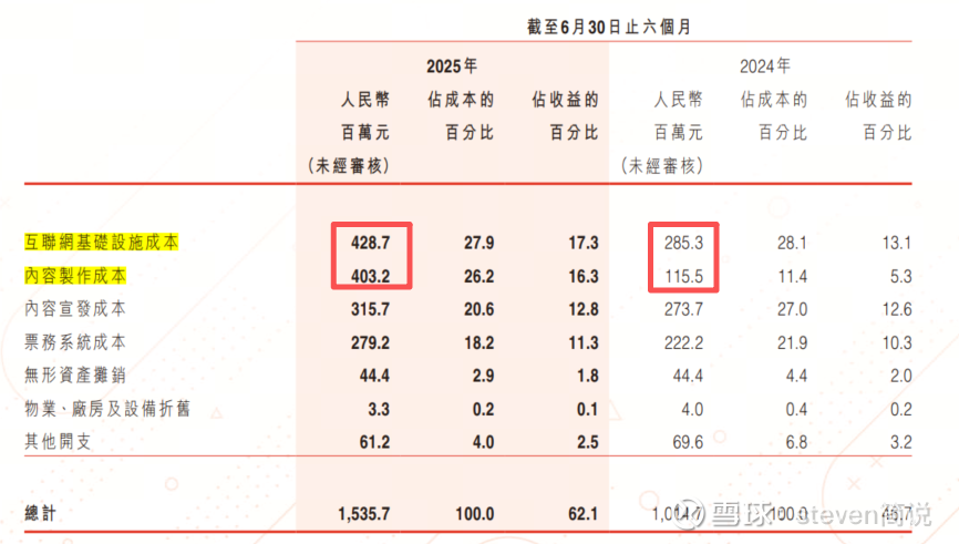 2、导致毛利率变低,主要原因出在“互联网基础设施成本”、“内容制作成本”大幅增加。