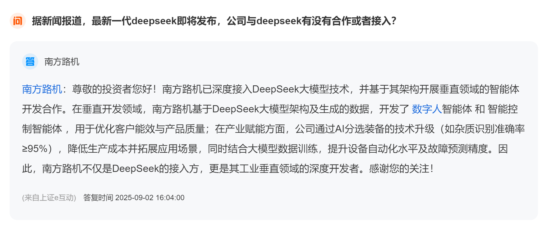 AI浪潮席卷千行百业,但多数传统企业的尝试止步于浅层应用。南方路机的不同之处在于,它选择了一条更重、更深度的路径。公司已明确表示,其不仅是DeepSeek等大模型的接入方,更是基于其架构开展垂直领域智能体开发的深度合作者。