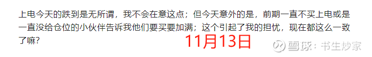 真正引发我担忧的是11月13日:指数大涨,而上电大跌,此时论坛里却一片欣欣向荣,大家都认定目前是在控制涨幅,随时准备停牌。这种一致性让我第一次感到担忧。