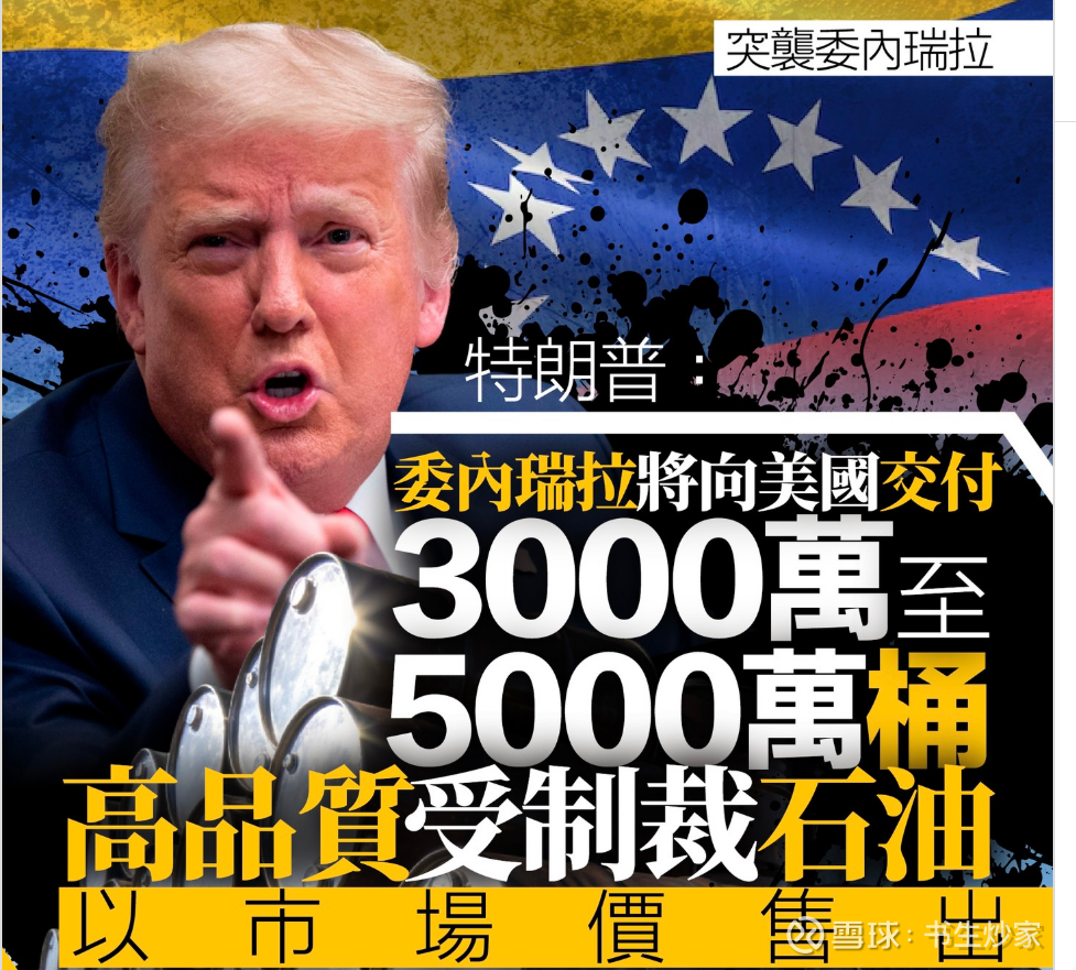 特朗普公开表示:委内瑞拉将向美国移交 3000 万至 5000 万桶原油。