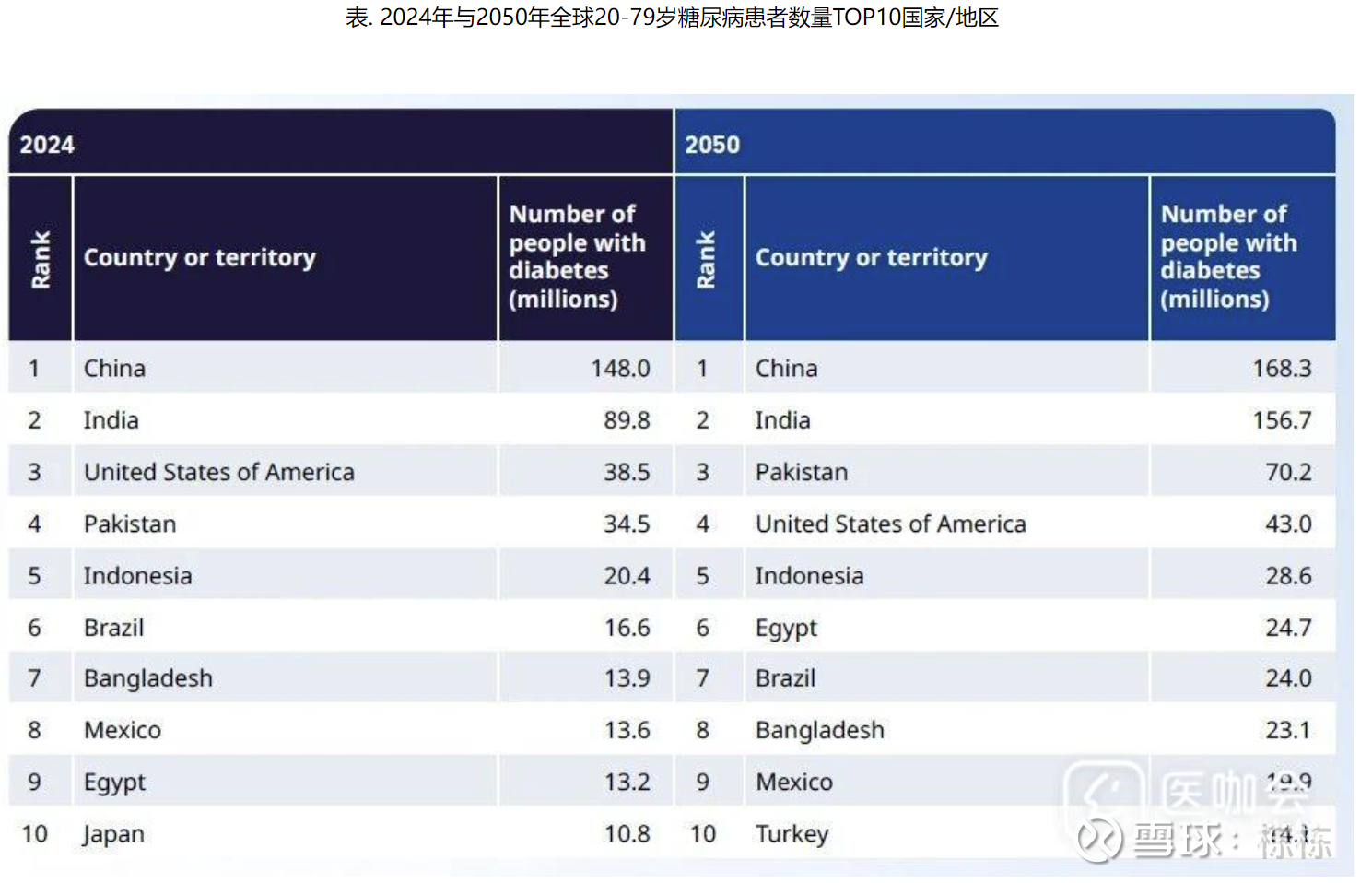 2024年20-79岁糖尿病患者总数最多的国家是中国(1.48亿)、印度(8980万)、美国(3850万)。预计到2050年,巴基斯坦将超越美国成为糖尿病患者数量第三大国。