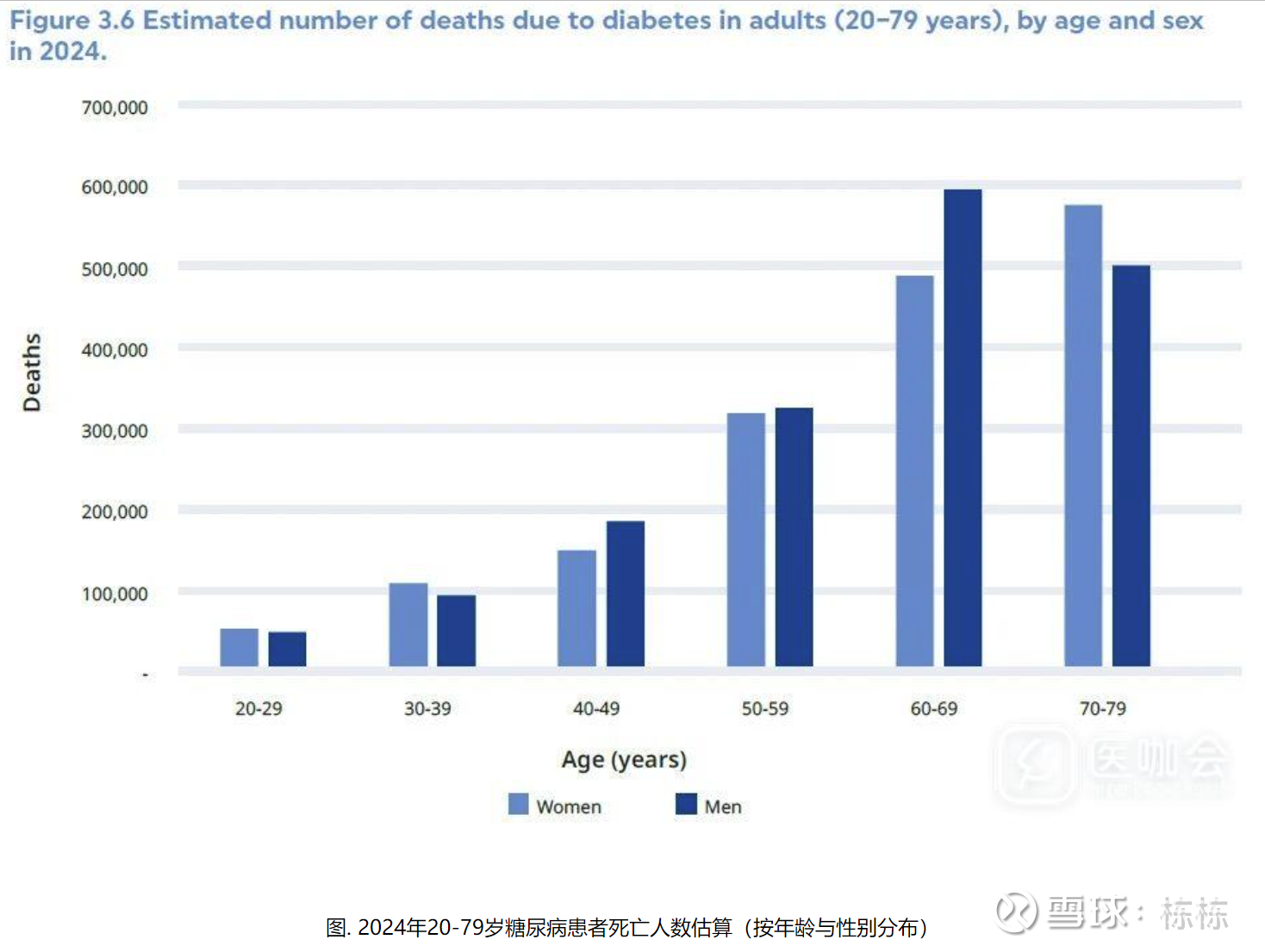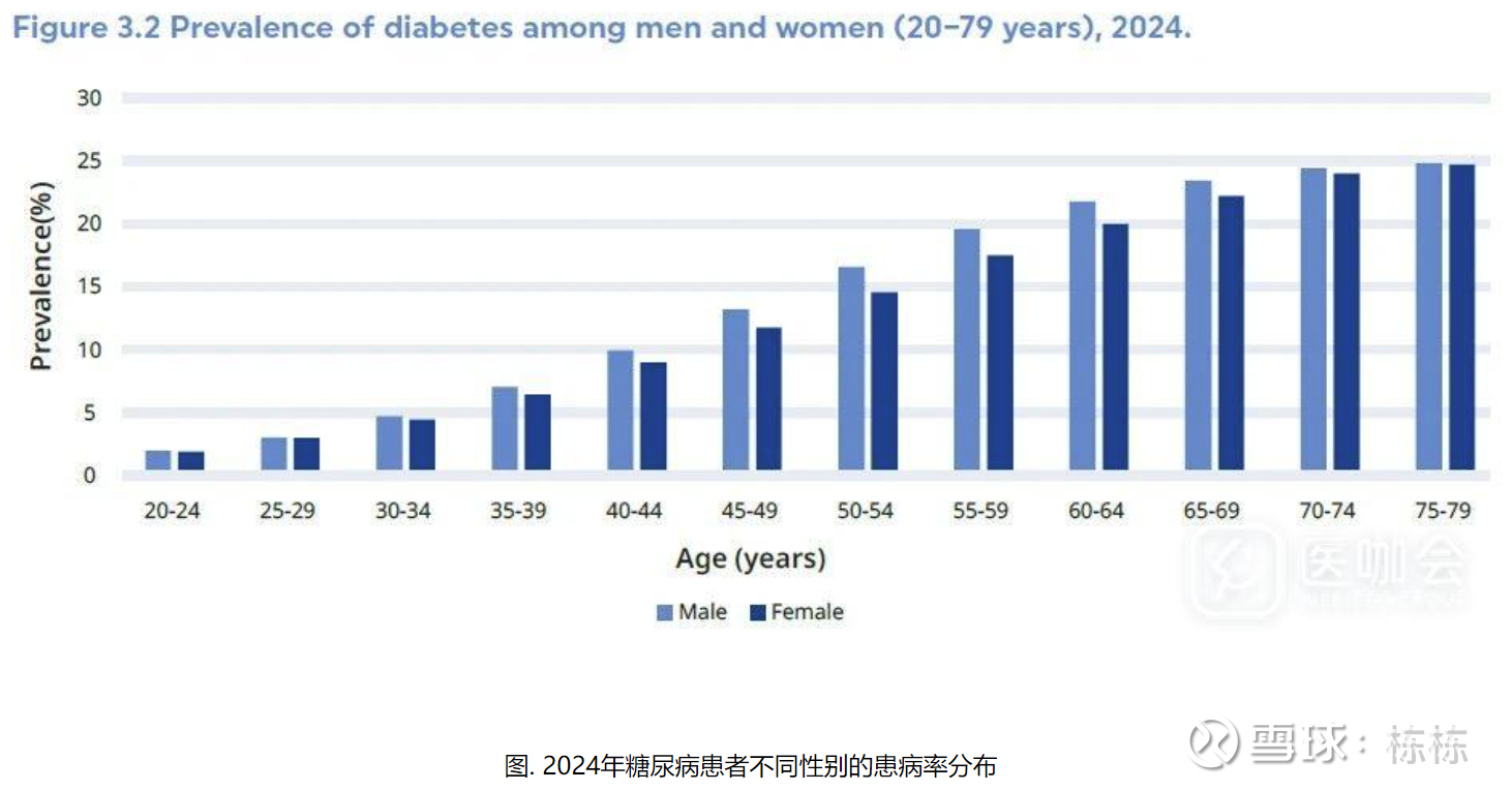 20-79岁年龄段中,男女糖尿病患病率基本持平(女性10.9% vs. 男性11.3%)。2024年全球男性糖尿病患者比女性多980万。