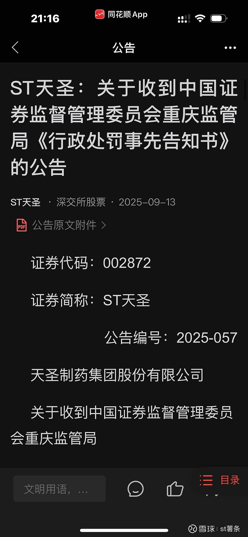 $ST天圣(SZ002872)$