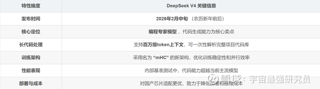 DeepSeek计划于2月中旬农历新年前后推出最新旗舰模型V4。基于公司内部基准开展的初步测试显示,该模型在代码生成领域的表现优于Anthropic、Claude、生成式预训练变换器系列(OpenAIGPT)等现有主流模型。