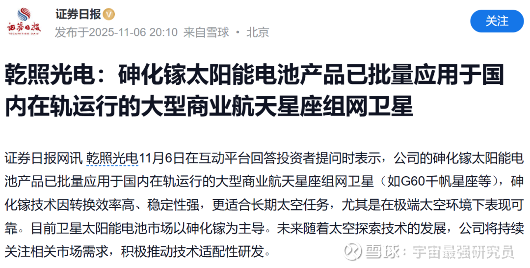 其砷化镓太阳能电池板转换效率高,适配太空环境,为卫星提供电力。