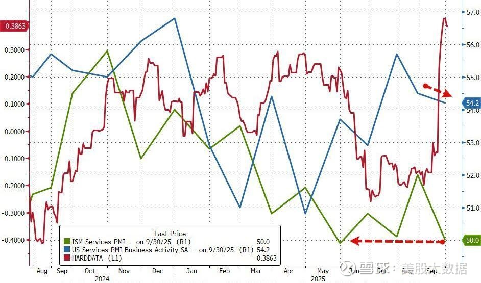 美国供应管理协会(ISM)公布的9月美国ISM服务业PMI超预期回落至50。更值得警惕的是,其商业活动分项指数五年以来首次跌入50下方的收缩区间。这份逊色的数据表明,美国服务业扩张势头显著放缓,对经济增长前景的担忧瞬间压过了此前的乐观情绪,导致股指涨幅迅速收窄。