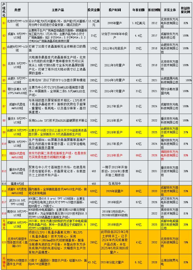 2026年结束折旧的产线:B11(绵阳6代线),每年折旧66亿,归属京东方为55亿;B17(武汉G10.5代线),每年折旧67亿,归属京东方为39亿。2027年两条产线合计减少133亿,归属京东方减少94亿。