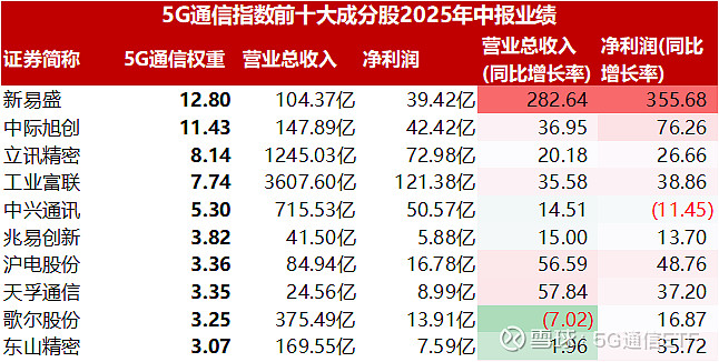 以聚焦服务器、光模块CPO、PCB的5G通信主题指数为例,2025年上半年,指数88%成分股实现净利润为正,70%成分股营业收入实现正增长,62%成分股实现净利润正增长。前十大成分股中,第一大权重股新易盛营收同比暴涨282%,净利润同比增长超355.6%。工业富联、立讯精密更是斩获千亿元营收。
