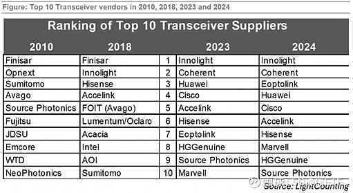 得益于5G大基建时代的丰厚积累,中国企业已经成为全球光通信产业的重要一极,尤其是光模块领域迅速追赶,已经占到全球50%的份额,2024年全球TOP10厂商中,中国企业占据7席,中际旭创、新易盛分别位列第一、第三。从整个产业来看,中际旭创、新易盛、光迅科技、剑桥科技等国内厂商已有1.6T光模块新产品落地,华工科技、联特科技已在研发阶段。