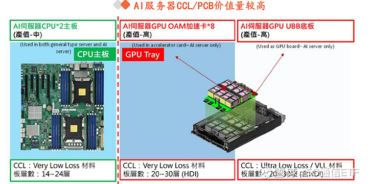 以英伟达八卡服务器为例,其搭载了8颗GPU算力卡,AI服务器的PCB价值增量主要集中于GPU模组,相关主要PCB层数不仅提升至20-30层,同时,CCL材料等级也有望进一步提升至Ultra Low Loss。