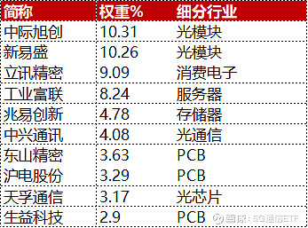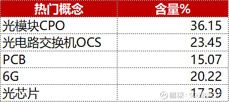 数据显示,其跟踪指数成分股中,光模块CPO概念股权重占比高达36%,PCB电路板概念股占15%,6G占比超20%,光芯片占比超17%。基本完整覆盖到了核心通信算力基础设施生态。