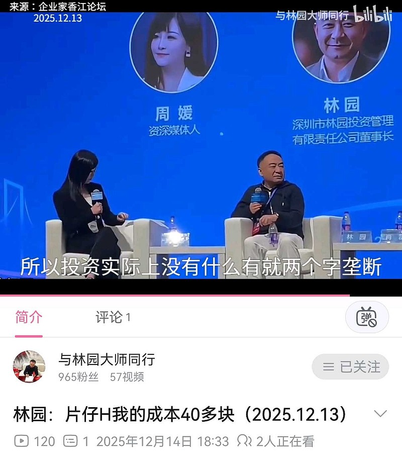 林园20251213~投资没有别的诀窍,就2个字,垄断片仔癀我的平均成本是40,用40算,我的股息率是很高的我是算我的账片仔癀他是垄断的,稀缺的,有效的$片仔癀(SH600436)$ $达仁堂(SH600329)$ $贵州茅台(SH600519)$A股市场长期的压抑,他涨起来是很快的
